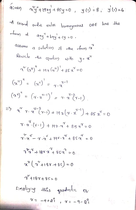 Solve the following initial value problem. x2y′′ + 19xy′ + 85y = 0, y(1) = 8, y′(1) ...