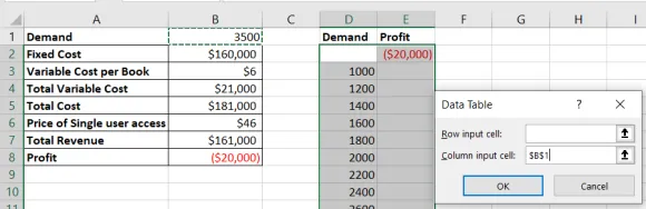b) Use a data table to vary demand from 1,000 to 6,000 in increments of 200 to test the sensitivity of profit to demand.
