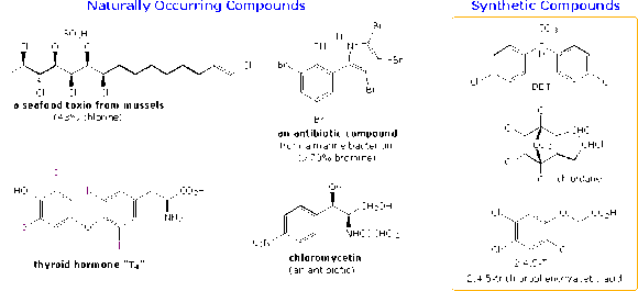 Halogen containing organic compounds are relatively rare in terrestrial plants and animals. The thyroid hormones T3 and T4 are exceptions; as is fluoroacetate, the toxic agent in the South African shrub Dichapetalum cymosum, known as "gifblaar". However, the halogen rich environment of the ocean has produced many interesting natural products incorporating large amounts of halogen. Some examples are shown below. Alkyl Halide Occurrence