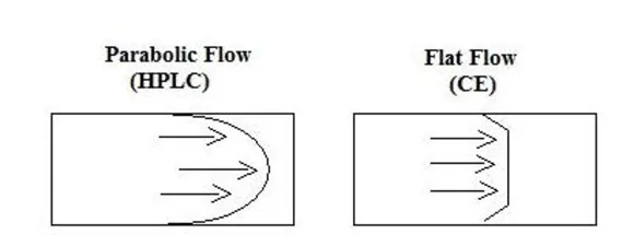 The narrow tubes used in capillary electrophoresis help to give the technique good resolution. When a sample is introduced in a tube and an electric field applied — the components move at different rates leading to separation. The advantages of using capillary tubes are that lateral diffusion effects are reduced and temperature differences across the tube are reduced. The properties of the tube, and other properties set by the technician, lead to what is known as plug flow where the velocity of the fluid is considered constant across the tube’s cross-section, perpendicular to the flow. Under plug flow, axial diffusion is the only factor leading to dispersion, so the separation efficiency using CE is very high. Using narrow capillaries also helps to reduce band-broadening seen in the peaks generated in other techniques such as high performance liquid chromatography (HPLC). In CE the velocity of the liquid as it travels along the tube is uniform across the tube. In the wider tubes and using pumped flow in other techniques, the velocity is not uniform across the tube. This is known as laminar flow, the velocity is slower at the interface between tube wall and liquid, giving a velocity profile with a bulge at the centre of the tube. This leads to band-broadening and the wider peaks seen in HPLC for example.