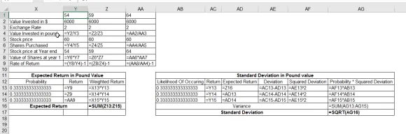 Suppose a U.S. investor wishes to invest in a British firm currently selling for £60 per share. The investor has $6,000 to invest, and the current exchange rate is $2/£. Consider three possible prices per share at £54, £59, and £64 after 1 year. Also, consider three possible exchange rates at $1.6/£, $2/£, and $2.4/£ after 1 year. Calculate the standard deviation of both the pound- and dollar-denominated rates of return if each of the nine outcomes (three possible prices per share in pounds times three possible exchange rates) is equally likely. (Do not round intermediate calculations. Round your answers to 2 decimal places.)
