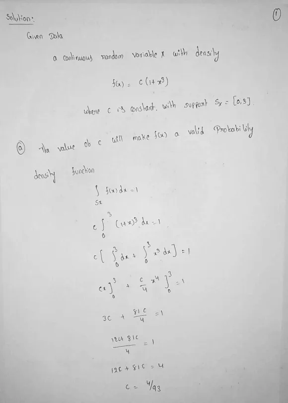 Say we have a continuous random variable X with density f(x) = c (1+x3) (where c is a constant) with support Sx = [0,3]