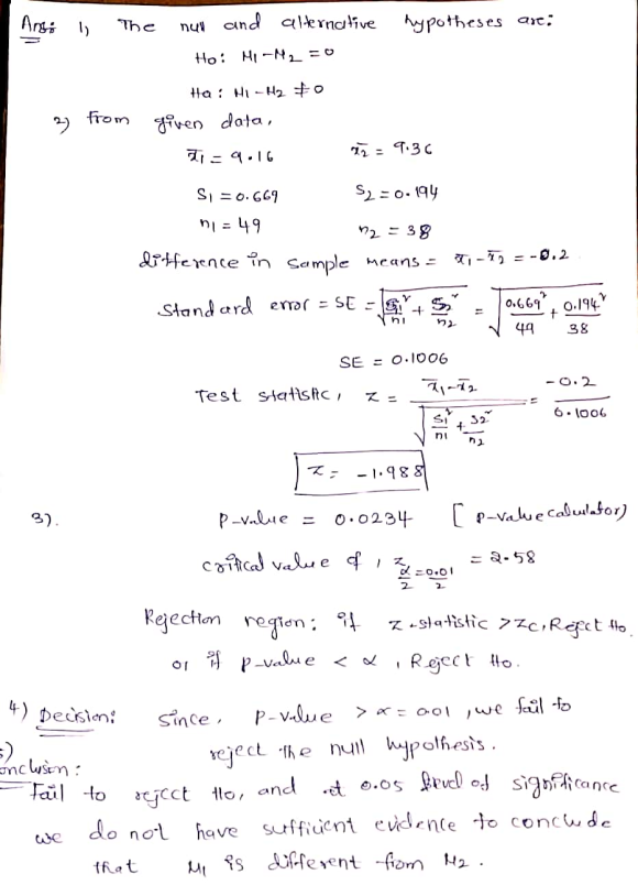 An engineer is comparing voltages for two types of batteries (K and Q) using a sample of 4949 type K batteries and a sample of 38 type Q batteries. The type K batteries have a mean voltage of 9.16, and the population standard deviation is known to be 0.669. The type Q batteries have a mean voltage of 9.36, and the population standard deviation is known to be 0.194. Conduct a hypothesis test for the conjecture that the mean voltage for these two types of batteries is different. Let μ1 be the true mean voltage for type K batteries and μ2 be the true mean voltage for type Q batteries. Use a 0.01 level of significance.