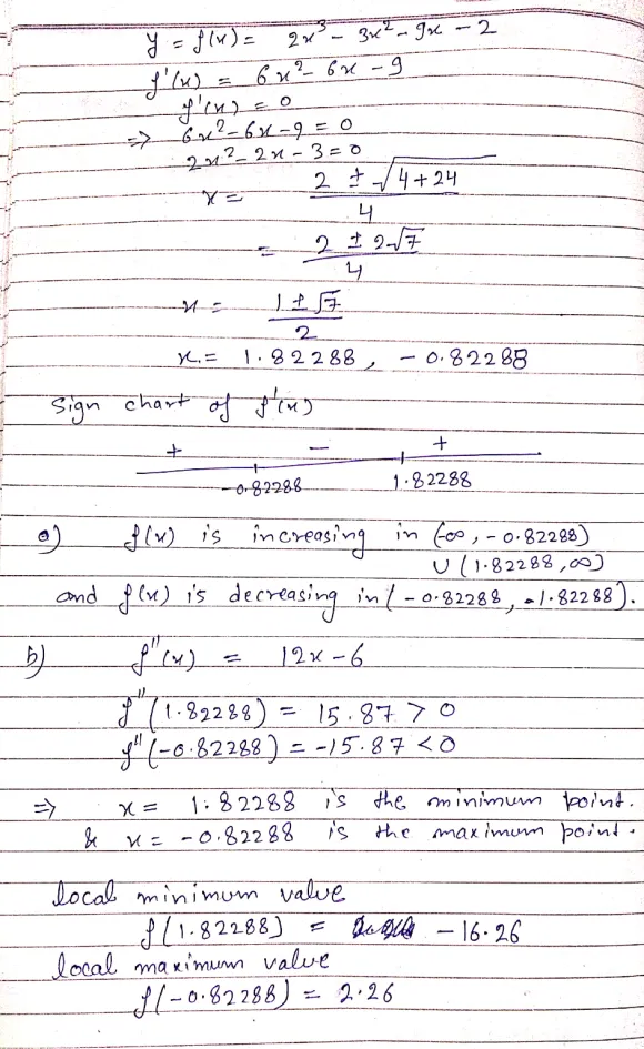 Consider the function y = f(x) = 2x3 − 3x2 − 9x − 2.