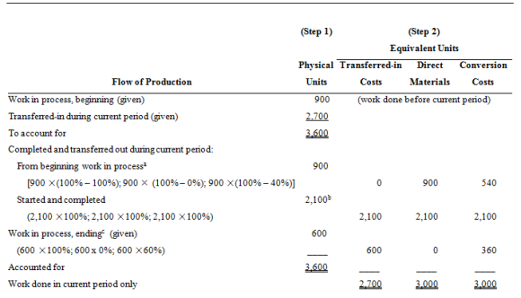 The equivalent units of work done in beginning inventory is: Transferred-in costs, 900 × 100% = 900; direct materials, 900 × 0% = 0; and conversion costs, 900 × 40% = 360. The cost per equivalent unit of beginning inventory and of work done in the current period are:
