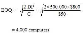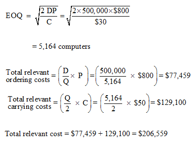 Effect of management evaluation criteria on EOQ model. Computers 4 U is an online company that sells computers to individual consumers. The annual demand for one model that will be shipped from the northeast distribution center is estimated to be 500,000 computers. The ordering cost is $800 per order. The cost of carrying a computer in inventory is $50 per year, which includes $20 in opportunity cost of investment The average purchase cost of a computer is $200.