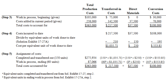 1, 2. & 3. Solution Exhibit 17-27A calculates the equivalent units of work done to date. Solution Exhibit 17-27B summarizes total costs to account for, calculates the cost per equivalent unit of work done to date for transferred-in costs, direct materials, and conversion costs, and assigns these costs to units completed and transferred out and to units in ending work-in-process inventory.