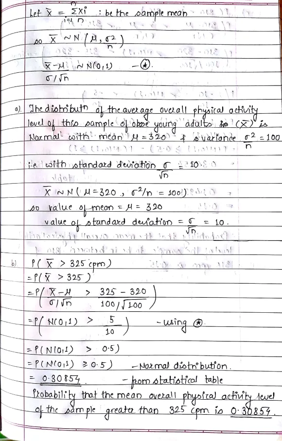 b) What is the probability that the mean overall physical activity level of the sample is greater than 325 cpm?
