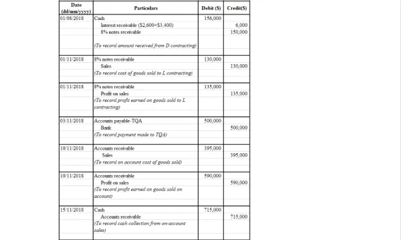 Sold appliances to Davis Contracting for $150,000 (cost, $65,000), receiving a 6-month, 8% note. Record two separate entries.