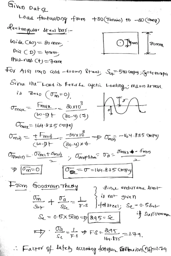 . A rectangular steel bar is subjected to a fluctuating load from 30 kN tension to 30 kN compression. The bar is 30 mm wide and 7 mm thick with a hole in the middle that is 4 mm in diameter. Find the fatigue and yield factor of safety if the steel is cold-drawn AISI 1040. If the fatigue factor nf<1 and ny>1 then that means that the system will fail at a finite number of cycles. If that is the case, estimate the number of cycles to failure.