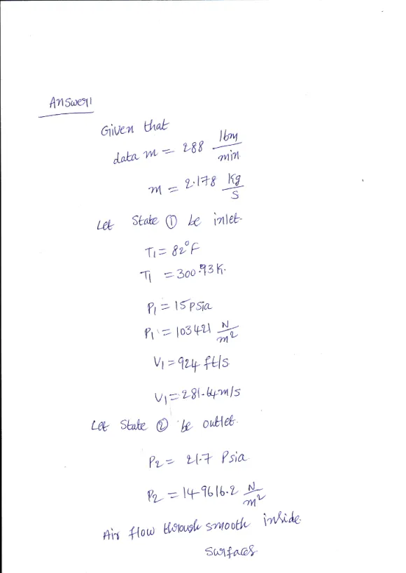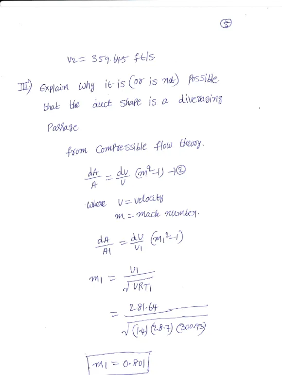 Air flows through a short duct with a smooth inside surface and gradually changing flow area. The measured flow rate is equal to 288 lbm/min. At the duct inlet, the temperature is equal to 82 deg F, and the pressure is equal to 15 psia. The inlet velocity is equal to 924 ft/s. At the duct exit, the pressure is equal to 21.7 psia. (I.) Calculate the cross-sectional flow area of the duct inlet. (II.) Estimate the temperature and velocity at the duct exit. (III.) Explain why it is (or is not) possible that the duct shape is a diverging passage. (IV.) Explain why it is (or is not) possible that the duct is a converging-diverging passage. (Hint: use quantitative reasoning and compressible flow theory for parts III and IV.)