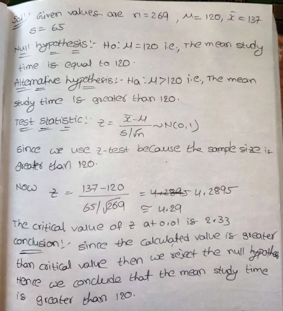 Suppose a study of n=269 students was conducted asking their weeknight study time. The mean response was 137 min. with an assumed KNOWN standard deviation of 65 min. The hypothesis of interest is whether the mean study time is GREATER than 120 min.