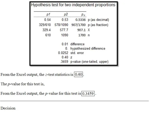 One month before an election, a poll of 610 randomly selected voters showed 54 % planning to vote for a certain candidate. A week later it became known that he had been nbsp a nbspjuvenile delinquent, and a new poll showed only 53 % of 1090 voters supporting him. Do these results indicate a decrease in voter support for his candidacy? a) Test an appropriate hypothesis and state your conclusion. b) If you concluded there was a difference, estimate that difference with a 99 % confidence interval and interpret your interval in context. a) Let p1 be the proportion of voters planning to vote for the candidate in the first poll, and p2 be the proportion of voters planning to vote for the candidate in the new poll. Choose the correct null and alternative hypotheses below. A. Upper H 0 : p 1 minus p 2 equals 0 Upper H Subscript Upper A Baseline : p 1 minus p 2 greater than 0 B. Upper H 0 : p 1 minus p 2 equals 0 Upper H Subscript Upper A Baseline : p 1 minus p 2 less than 0 C. Upper H 0 : p 1 minus p 2 not equals 0 Upper H Subscript Upper A Baseline : p 1 minus p 2 equals 0 D. Upper H 0 : p 1 minus p 2 equals 0