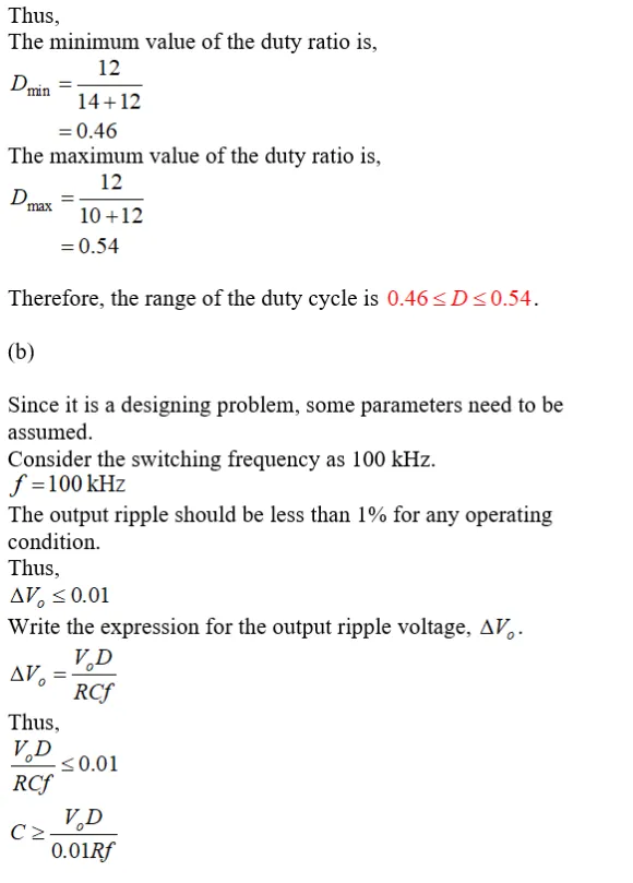 Design a buck-boost converter with a source varying from 10 to 14 V. The output voltage is regulated at – 12 V. The load varies from 10 to 15 W. The output voltage ripple must be less than 1 % for any operating condition. a) Determine the range of the duty ratio of the switch. b) Design the inductor and capacitor values used in your design. c) Confirm your solutions using a simulation software for every operating condition (you must show the input voltage, the duty ratio, the output voltage “including the ripple” and the inductor current “including the ripple”). Already have sloution for part (a) and (b), need help with part (c).