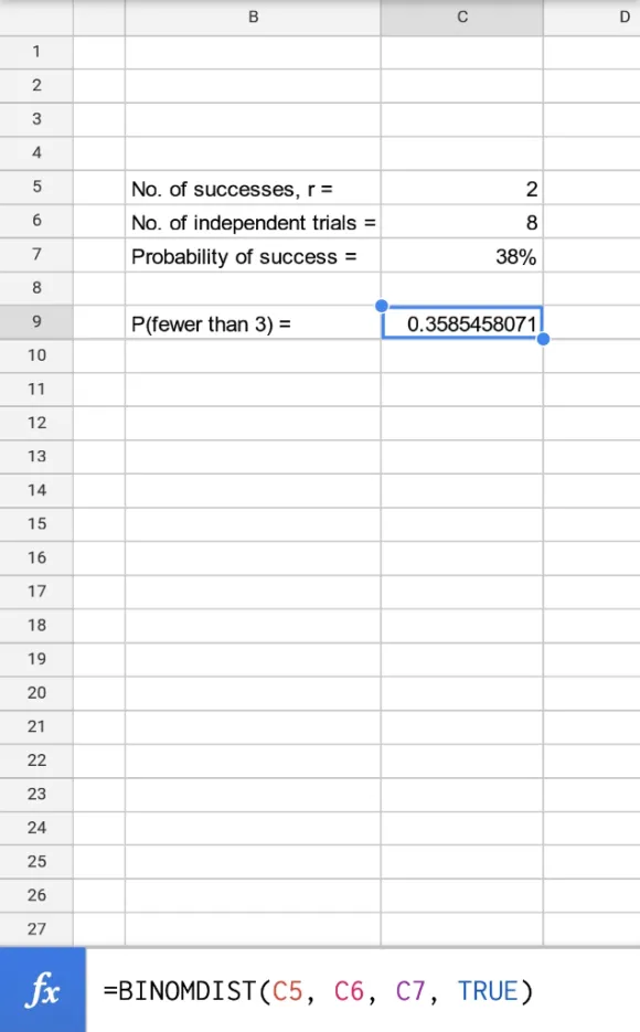 =BINOMDIST(number of successes, number of independent trials, probability of SUCCESS, TRUE)