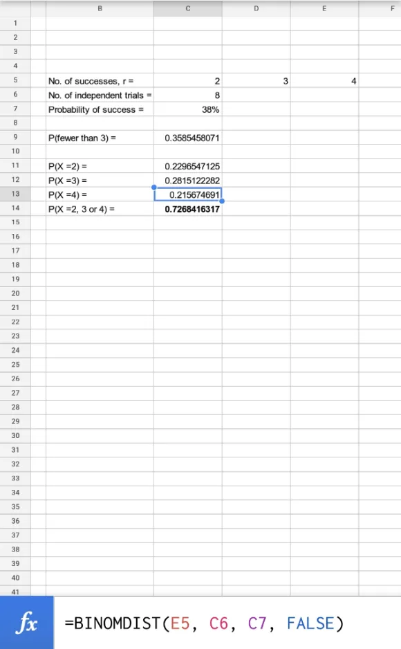 =BINOMDIST(number of successes, number of independent trials, probability of success, FALSE)