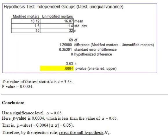 5. An experiment to compare the tension bond strength of polymer latex modified mortar (Portland cement mortar to which polymer latex emulsions have been added during mixing) to that of unmodified mortar resulted in ¯x = 18.12 kgf/cm 2 for the modified mortar (m=40) and ¯y = 16.87 kgf/cm 2 for the unmodified mortar (n= 32) . Let µ1, µ2 be the true average tension bond strengths for the modified and unmodified mortars, respectively. Assume that the bond strength distributions are both normal. a) Assuming that σ1 = 1.6 and σ2 = 1.4, do we have enough evidence to support the claim that true average of tension bond strengths the modified mortars is larger at level .01 b) Find a 90% confidence interval on the difference in mean batch viscosity resulting from the process change. c) How would the analysis and conclusion of part (a) change if σ1, σ2 were unknown but S1 = 1.6 and S2 = 1.4 ?.