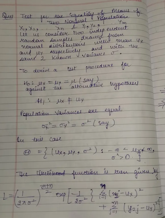 Let X1,X2,...,Xn and Y1,Y2,...,Ym be independent random samples drawn from normal distributions with means μX and μY , respectively, and with the same 2 known variance σ . Use the generalized likelihood ratio criterion to derive a test procedure for choosing between H0:μX =μY and H1:μX not equal to μY.