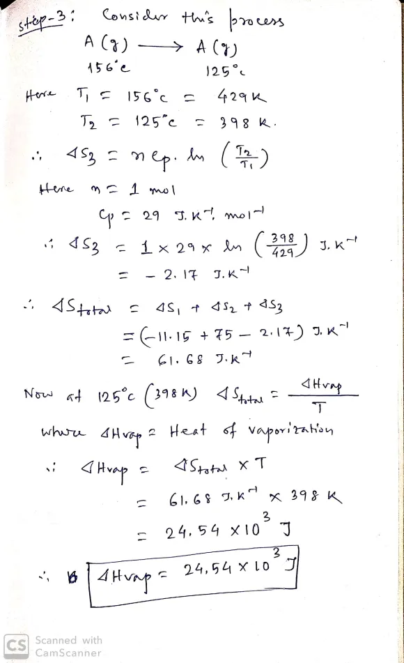 Consider the process A(l) → A(g) 70.°C 156°C which is carried out at constant pressure. The total ΔS for this process is known to be 75.0 J K−1 mol−1. For A(l) and A(g), the Cp values are 75.0 J K−1 mol−1 and 29.0 J K−1 mol−1, respectively, and are not dependent on temperature. Calculate ΔHvaporization for A(l) at 125°C (its boiling point).