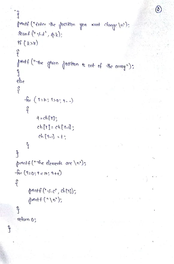 Write a program to remove an element from an array at the given position k and push the rest of the array elements one position back. Then insert the removed element at the beginning. Position k is entered through keyboard. For example, if the original array x is {'r', 'c', 'm', '7', 'w', '3', 'q'} and k = 3, the array will be changed to {'7', 'r', 'c', 'm', 'w', '3', 'q'}. Hint: Sequence of moving the element is important. You need to define a temp variable to hold value of x[k] before you move the rest of the array elements one position back. Finally, put the saved temp variable to the first element of the array. (in C please)