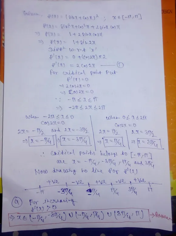 For the given function determine the following: f (x) = (sin x + cos x) 2 ; [−π,π] a) Find the intervals where f(x) is increasing, and decreasing b) Find the intervals where f(x) is concave up, and concave down c) Find the x-coordinate of all inflection points
