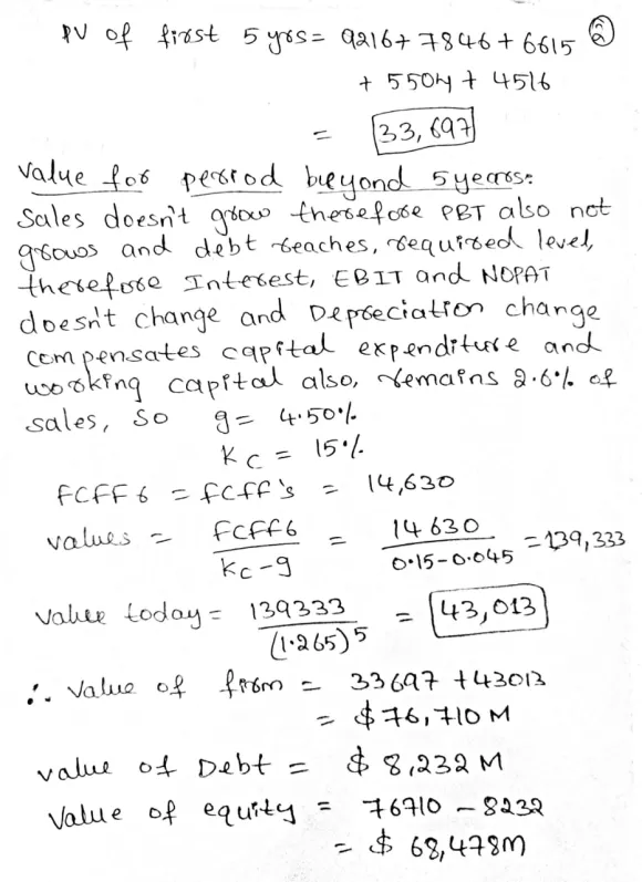 Okamoto Industries has just published their financials for FY 2018. They generated JPY 85,450,000,000 in sales and maintained their 35% gross margin and 15% net margin. During that year the company had debt outstanding of JPY 8,232,000,000 with a 3.65% coupon rate. The company was taxed at the 21.5% rate. The company also had depreciation charges of JPY 635,000,000. Fixed capital investment was 85% of depreciation and working capital investment was 2.6% of sales. The company believes that it can maintain high growth of sales at 18% for the next five years where it will then fall to its long term growth rate of 4.5%. Both gross and net margin will decline by 1% per year (next year gross margin will be 34%) until they reach their stable levels of 30% and 10% respectively. The company will pay down debt by 500,000,000 for the next five years before reaching a sustainable debt level with the same coupon rate. Depreciation charge will decrease by 10% per year for five years. Fixed capital investment will increase by 5% relative to depreciation charge each year until it reaches 100% of depreciation charges and remain at that level. Working capital will remain 2.6% of sales. During the high growth phase, the company’s WACC is estimated to be 26.5% while the longer term WACC is calculated to be 15%. (5 pts for each subsection) A) What is the FCFF to the firm in 2018? B) What is the FCFF to the firm in 2019? C) What is the value of the firm using DCF valuation? D) What is the equity value of the firm assuming the initial debt value is at market value?