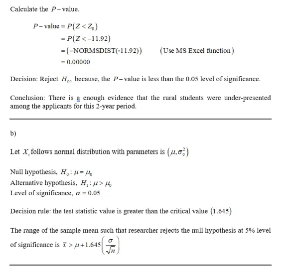 a. In 2002 to 2004, there were 4948 Ontario residents applied to the province’s medical schools. Of these 4948 applicants, 4588 were from urban areas and the rest were from rural areas. Statistics Canada reported that 13% of the Ontario’s population live in rural areas. Do the data suggest that rural students were underrepresented among the applicants for this two-year period? Perform the test at the significance level of 0.01.