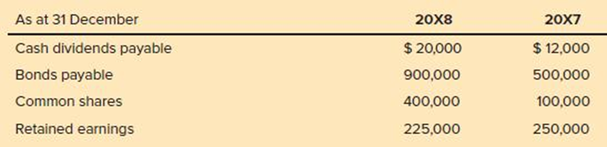 Selected accounts from the SFP of Passen Ltd. at 31 December 20X8 and 20X7 are presented below. Passen reported earnings of $100,000 in 20X8. There was a stock dividend recorded, valued at $50,000 that reduced retained earnings and increased common shares.