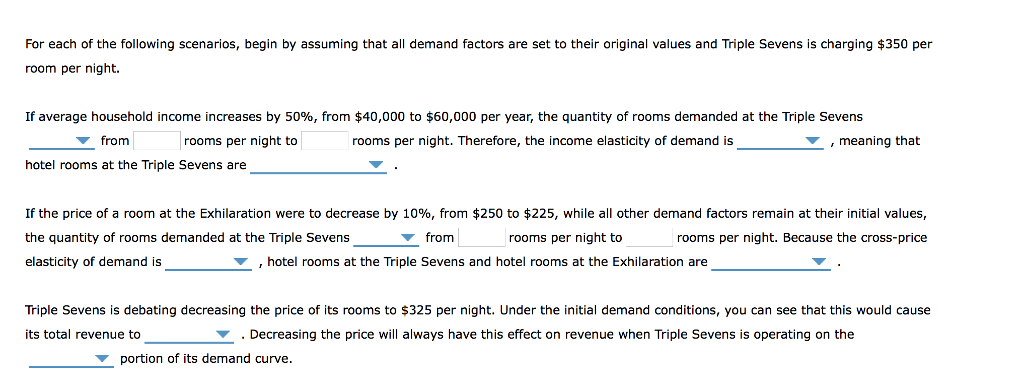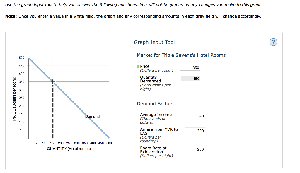 The following graph input tool shows the daily demand for hotel rooms at the Triple Sevens Hotel and Casino in Las Vegas, Nevada. To help the hotel management better understand the market, an economist identified three primary factors that affect the demand for rooms each night. These demand factors, along with the values corresponding to the initial demand curve, are shown in the following table and alongside the graph input tool.