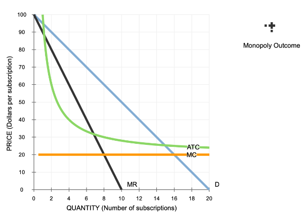The following graph shows the demand (D) for cable services in the imaginary town of Utilityburg. The graph also shows the marginal revenue (MR) curve, the marginal cost (MC) curve, and the average total cost (ATC) curve for the local cable company, a natural monopolist.