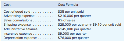 In addition, the variable manufacturing overhead rate is $1.80 per direct labor-hour. The fixed manufacturing overhead is $97,000 per quarter. The only noncash element of manufacturing overhead is depreciation, which is $37,000 per quarter.