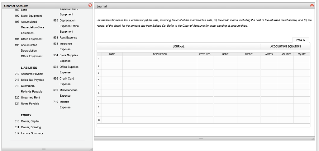 Journalize Showcase Co.'s entries for (a) the sale, including the cost of the merchandise sold, (b) the credit memo, including the cost of the returned merchandise, and (c) the receipt of the check for the amount due from Balboa Co. Refer to the Chart of Accounts for exact wording of account titles.