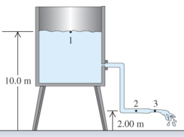 Water flows steadily from an open tank as shown in the figure. (Figure 1) The elevation of point 1 is \(10.0 \mathrm{~m},\) anc the elevation of points 2 and 3 is \(2.00 \mathrm{~m}\). The crosssectional area at point 2 is \(4.80 \times 10^{-2} \mathrm{~m}^{2} ;\) at point 3 where the water is discharged, it is \(1.60 \times 10^{-2} \mathrm{~m}^{2}\). The cross-sectional area of the tank is very large compared with the cross-sectional area of the pipe.