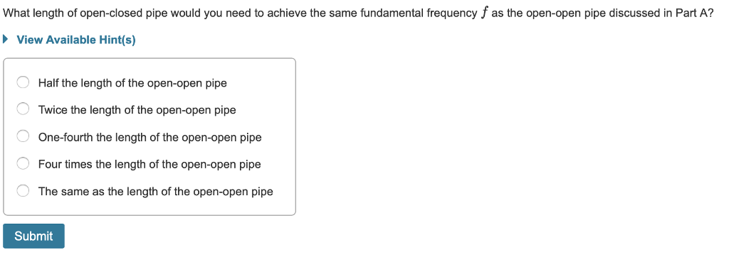What length of open-closed pipe would you need to achieve the same fundamental frequency \(f\) as the open-open pipe discussed in Part A?