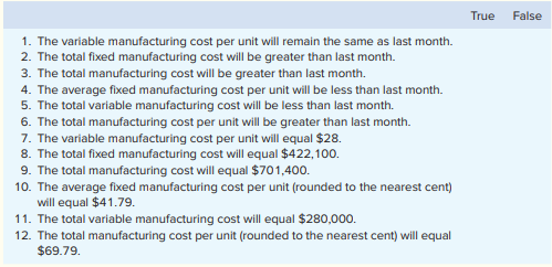 Assume that next month Munchak produces 10,050 units and that its cost behavior patterns remain unchanged. Label each of the following statements as true or false with respect to next month. Do not use a calculator to answer items 1 through 6. You can use a calculator to answer items 7 through 12. Record your answers by placing an X under the appropriate heading.