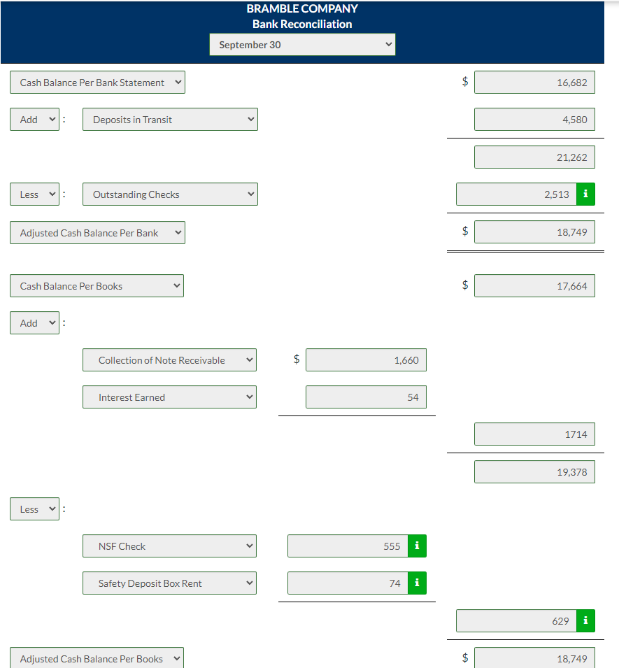 The September bank statement shows a balance of $16,682 on September 30 and the following memoranda.