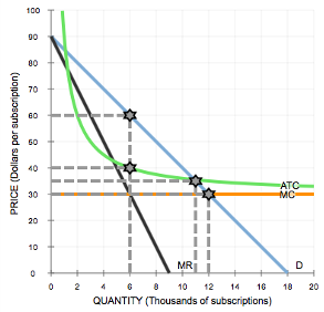 Consider the local telephone company, a natural monopoly. The following graph shows the monthly demand curve for phone services and the company's marginal revenue (MR), marginal cost (MC), and average total cost (ATC) curves.