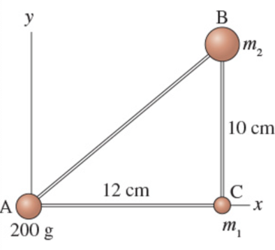 The three masses shown in (Figure 1) are connected by massless, rigid rods. Assume that m1 = 180 g and m2 = 350 g.