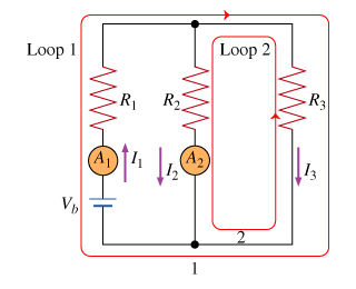 >Apply the loop rule to loop 2(the smaller loop on the right). Sum the voltage changes across each circuit element around this loop going in the direction of the arrow. Remember that the current meter is ideal.