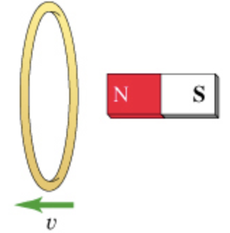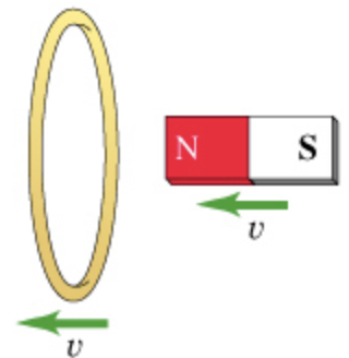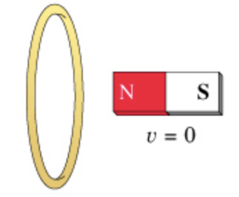 For each of the actions depicted below, a magnet and/or metal loop moves with velocity v? (v? is constant and has the same magnitude in all parts). Determine whether a current is induced in the metal loop. If so, indicate the direction of the current in the loop, either clockwise or counterclockwise when seen from the right of the loop. The axis of the magnet is lined up with the center of the loop.