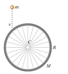 A stationary bicycle wheel of radius 0.8 m is mounted in the vertical plane (see figure below). The axle is held up by supports that are not shown, and the wheel is free to rotate on the nearly frictionless axle. The wheel has mass 4.2 kg, all concentrated in the rim (the spokes have negligible mass). A lump of clay with mass 0.5 kg falls and sticks to the outer edge of the wheel at the location shown. Just before the impact the clay has speed 7 m/s, and the wheel is rotating clockwise with angular speed 0.27 rad/s. (Assume +x is to the right, +y is upward, and +z is out of the page. Assume the line connecting the center to the point of impact is at an angle of 45° from the horizontal.)