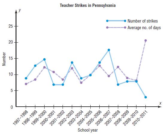 In Pennsylvania there were more teacher strikes in 2004 than there were in all other states combined. Because of the disruptions, state legislators want to pass a bill outlawing teacher strikes and submitting contract disputes to binding arbitration. The graph shows the number of teacher strikes in Pennsylvania for the school years 1997 to 2011. Use the graph to answer these questions.